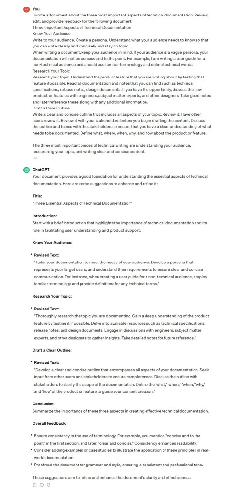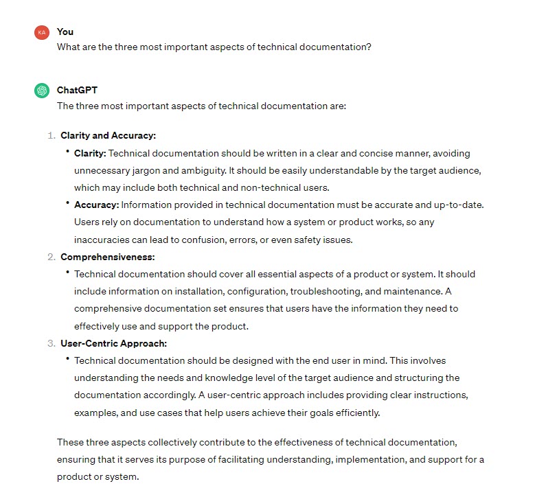 Then entered the following prompt in ChatGPT “What are the three most important aspects of technical documentation?” The following screenshot includes the prompt and the output from the chatbot.